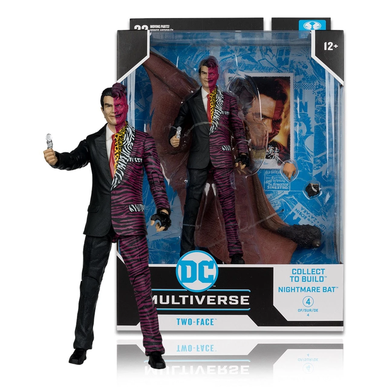 Batman faces off against two foes: the schizophrenic, horribly-scarred former District Attorney Harvey Dent, aka Two-Face, and the Riddler, a disgruntled ex-Wayne Enterprises inventor seeking revenge against his former employer by unleashing his brain-sucking weapon on Gotham City’s residents. Inspired by Batman Forever, these Incredibly detailed 7″ scale figures are Designed with Ultra Articulation with up to 22 moving parts for full range of posing and play! Each figure includes Accessories, collectible art card with character art on the front, and character biography on the back, as well as pieces that when combined with the rest of the Batman Forever Build-a line will assemble the NIGHTMARE BAT! Collect Batman, Robin, Riddler, and Two-Face!