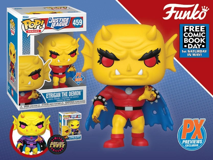 Gone, gone, the form of man, Rise, the demon Etrigan! With those words, Jason Blood, an immortal knight from the court of King Arthur, transforms into Etrigan the Demon, half-brother of the wizard Merlin. Created by Jack Kirby in 1972 for DC Comics and subsequently developed by creators such as Matt Wagner, Alan Grant, Garth Ennis, and Paul Cornell, Etrigan the Demon has also appeared in animation, such as The New Batman Adventures, Justice League, and Batman: The Brave and the Bold, as well as video games such as LEGO Batman 3 and LEGO DC Super-Villains. Funko summons the Demon Etrigan to a new realm for Free Comic Book Day with the PREVIEWS Exclusive POP! DC Heroes: Etrigan the Demon Vinyl Figure. Available exclusively in comic shops beginning Free Comic Book Day, the POP! Demon gives Kirby’s creation the stylized Funko design so beloved by collectors. Plus, fans and collectors can seek out the limited chase edition which features a blacklight paint deco that gives the Demon an eerie glow as though he has just transformed from Jason Blood into his demonic form! Cast the spell and summon the limited edition Demon to your Funko POP! collection this Free Comic Book Day!Â