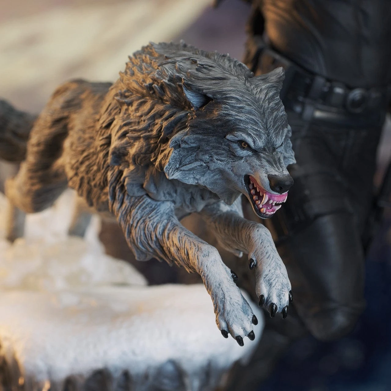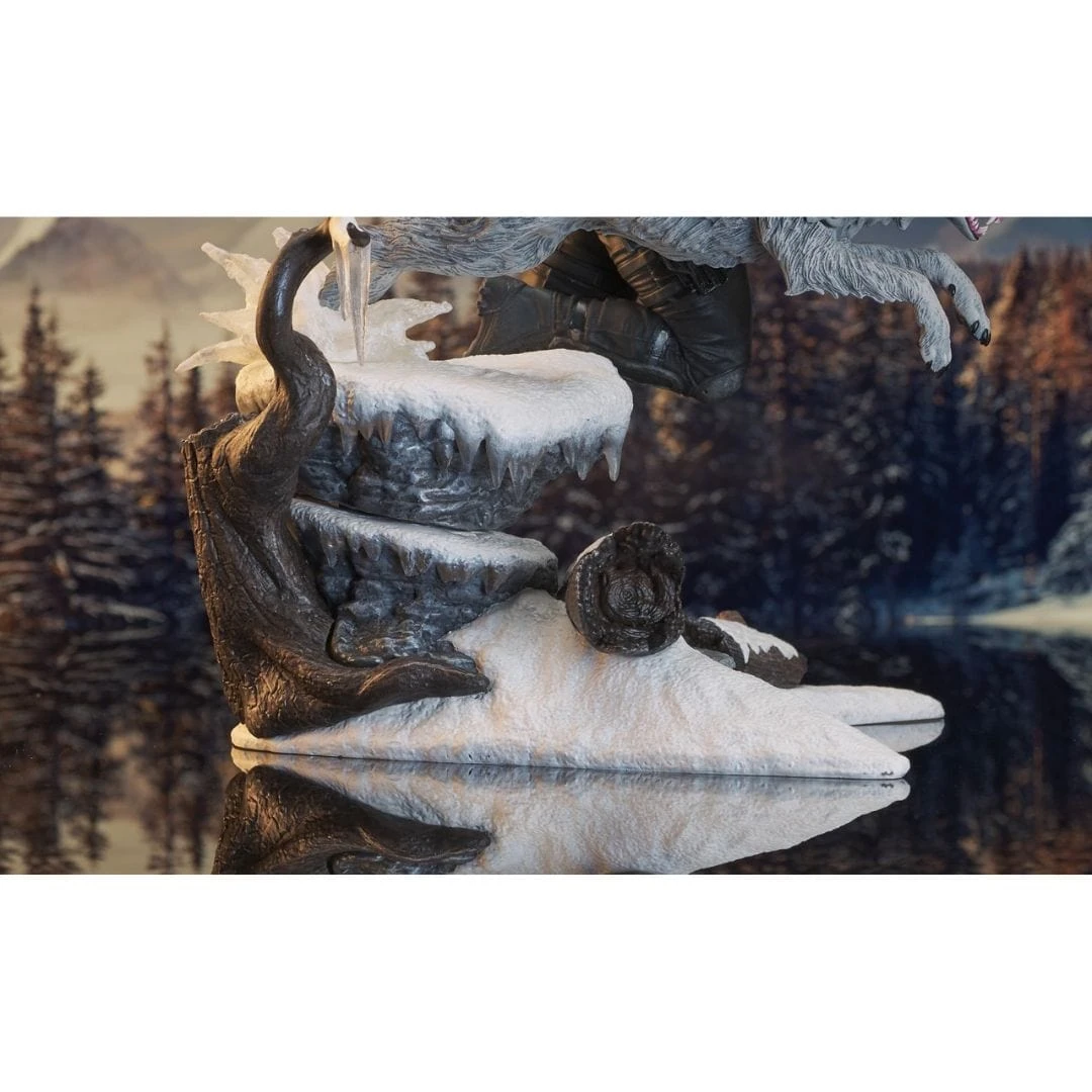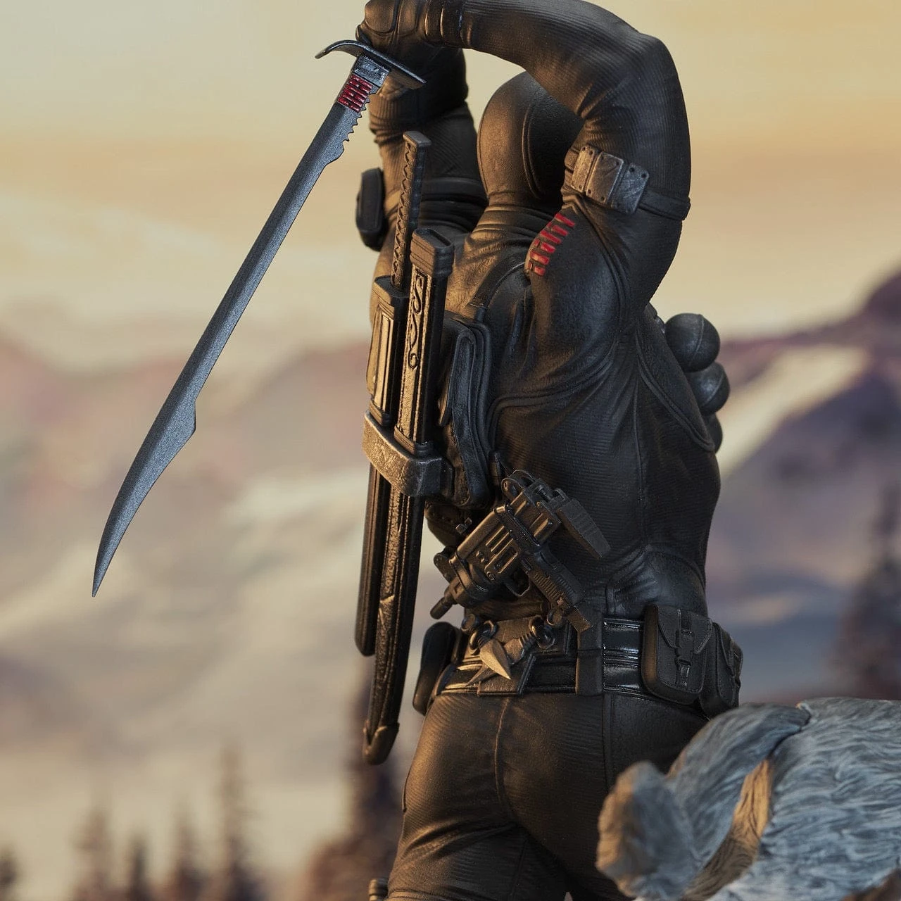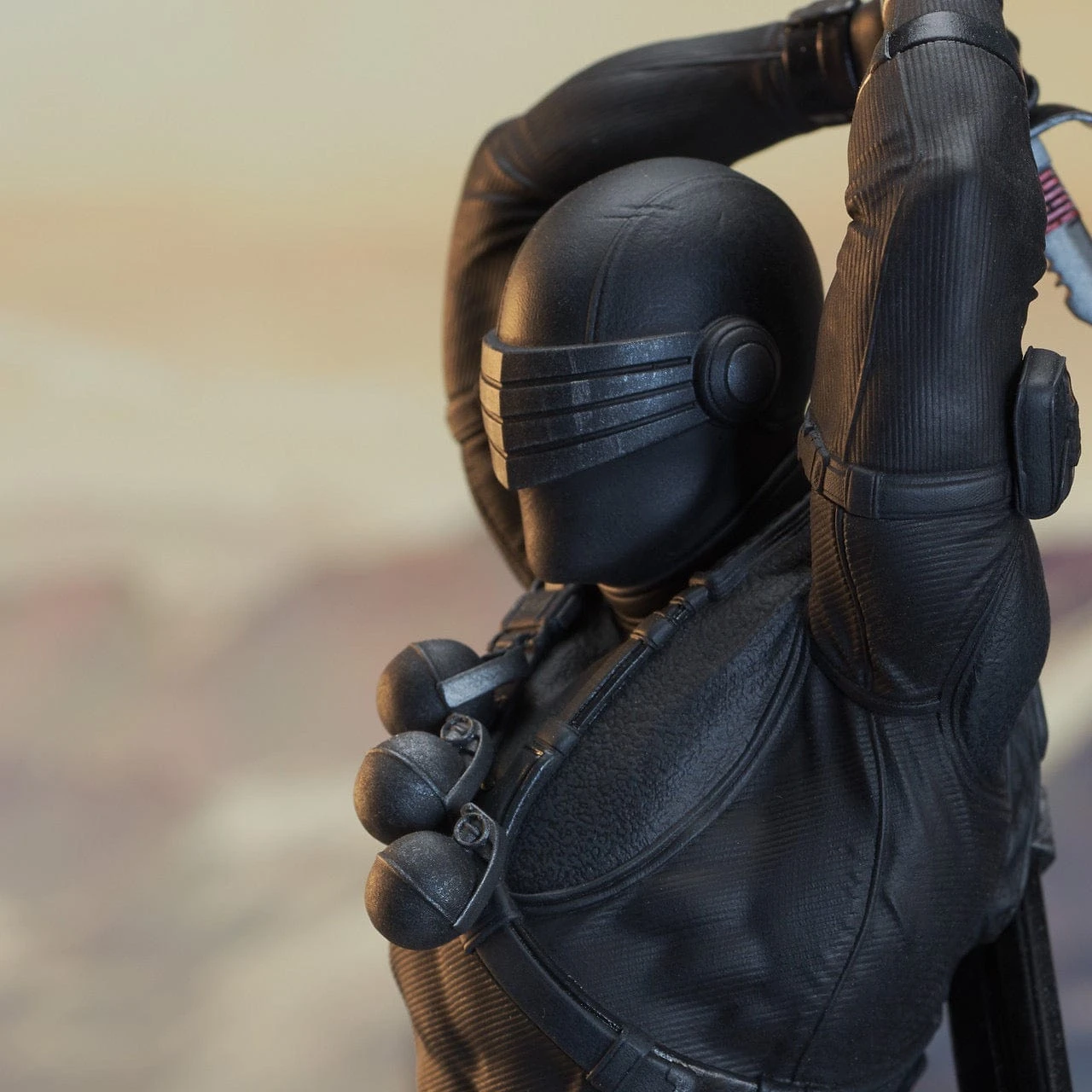 G.I. Joe’s silent ninja, Snake Eyes, leaps from a snowy ledge in this all-new PVC diorama from Diamond Select Toys! Flanked by his wolf companion Timber, Snake Eyes wields his trademark sword as he launches his sneak attack. Measuring approximately 11″ tall, this diorama features detailed sculpting and paint applications, and comes packaged in a full-color window box.