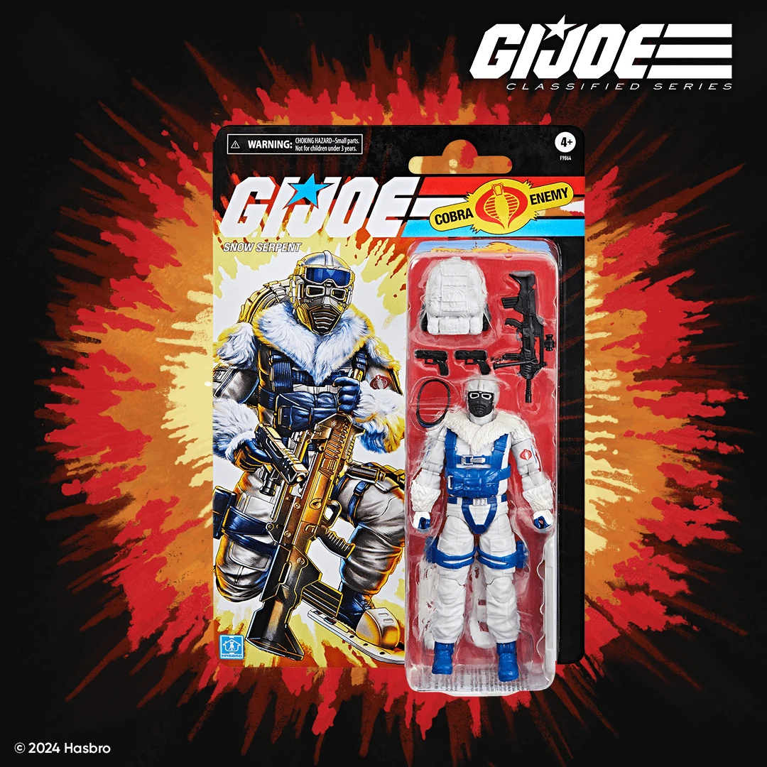 New to the G.I. Joe Classified Series line, Snow Serpent comes ready for adventure, with multiple points of articulation for high poseability. This Snow Serpent figure contains 8 character-inspired accessory pieces including goggles, snowshoes, backpack, 3 weapon accessories, and a figure stand. Snakes usually tend to be cold blooded, but Snow Serpents thrive in polar temperatures as the frontline arctic infantry troopers of the Cobra forces. They train to parachute onto ice floes before marching miles with full field pack, assault rifle and anti-tank weapon. Snow Serpents can traverse vast icy plains and then vanish in a snow drift remaining unmoving for hours or even days only to emerge with a lethal barrage on their unsuspecting foes.