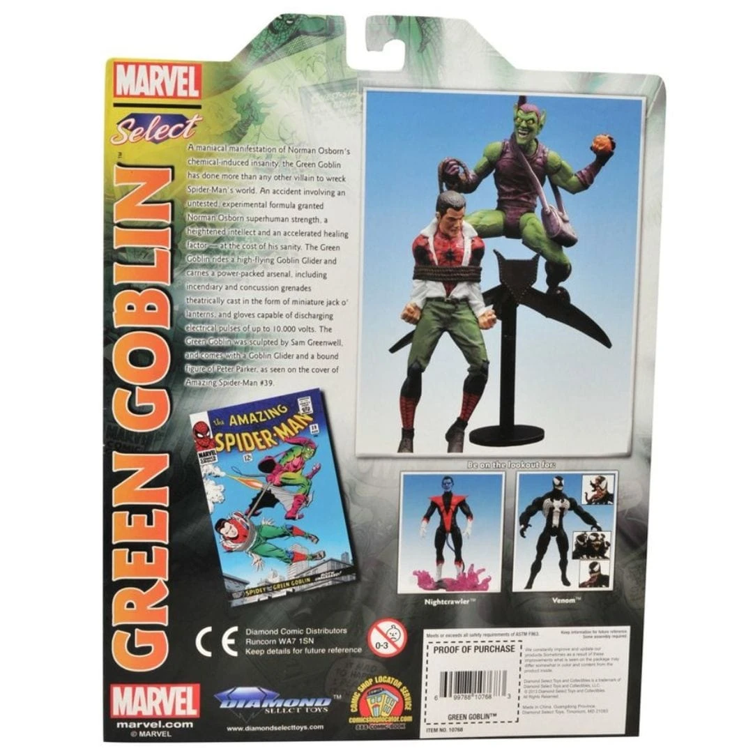 Straight from the cover of Amazing Spider-Man #39 comes the next Marvel Select action figure, The 5 1/2-inch Green Goblin! Toy Biz and Diamond Select bring to life one of the biggest moments in Spider-Man lore – the unmasking of the web-slinger at the hands of his greatest foe! Featuring 12 points of articulation, the Green Goblin includes a detachable pumpkin bomb and bomb satchel, Goblin Glider with stand, and a Peter Parker/Spider-Man victim accessory figure. Packaged in a deluxe blister card package.