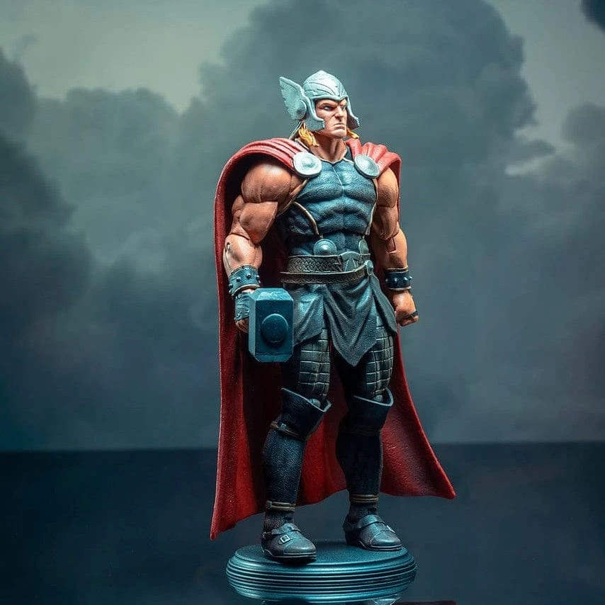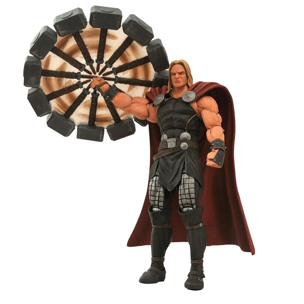 Summon Mjolnir with this Might Thor figure! Descending from Asgard, this highly detailed figure of Thor, God of Thunder, features multiple interchangeable parts including Mjolnir, a spinning hammer effect, and an alternate unhelmeted head. Measuring approximately 8″ tall, this fully poseable figure has 16 points of articulation, and comes packaged in display-ready Select action figure packaging.