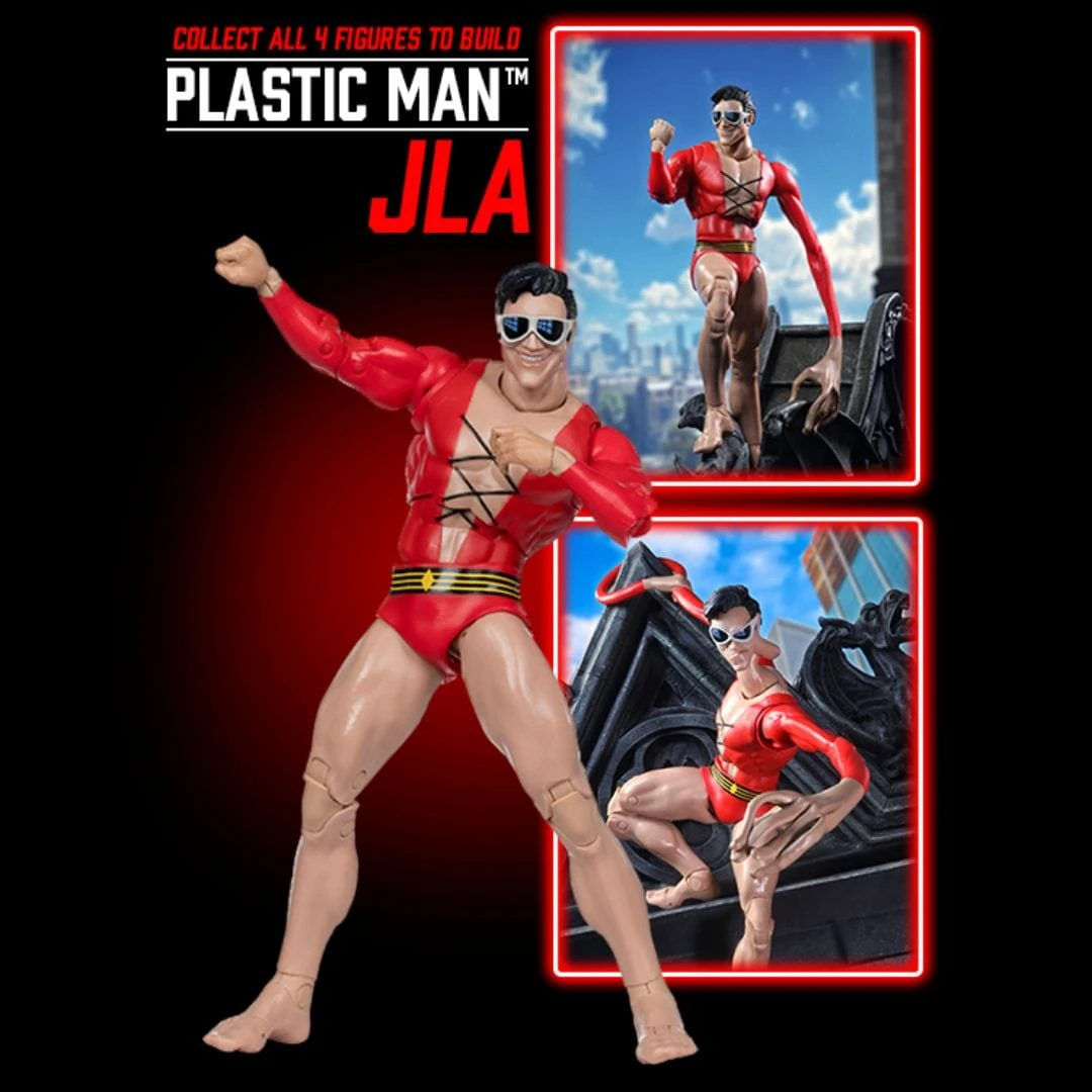 Combine all 4-pieces from the rest of the JLA Build-a line including Batman, Aquaman, Superman, and Green Lantern to assemble Plastic Man!