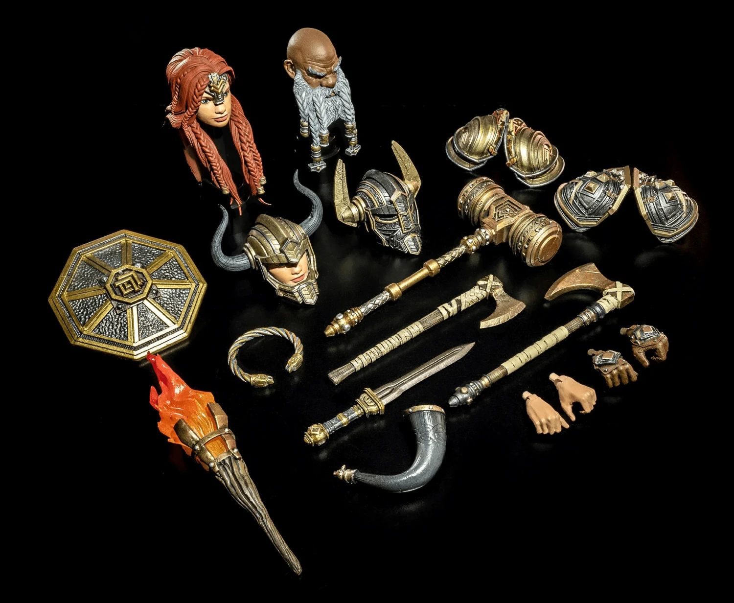 - Accessories: Dwarven sword v2 with scabbard, Viking single-bladed axe, dwarven single-sided axe, dwarven shield v2, drinking horn, torch with red/orange flame, dwarven hammer v2, soft goods cloak, belt trinket, extra sets of hands