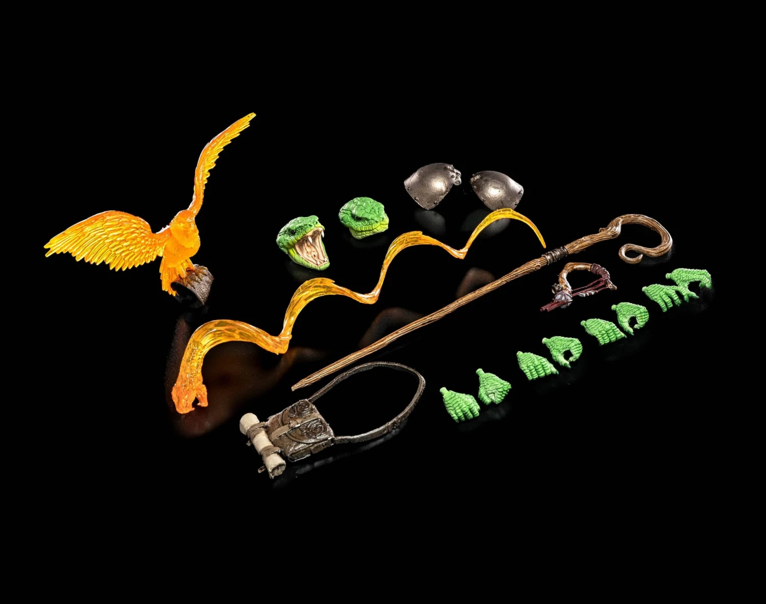 This figure comes with 2 total heads and it also includes extra hands, 2 “magically conjured” animal companions, magic staff with 2 toppers, hip bag and belts, shoulder armor, and premium wired soft goods cloak and skirt.