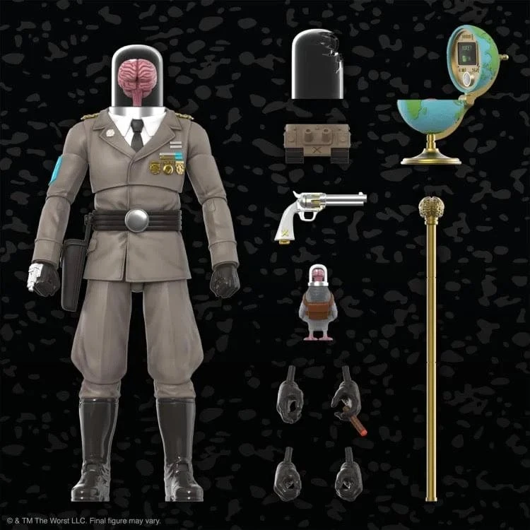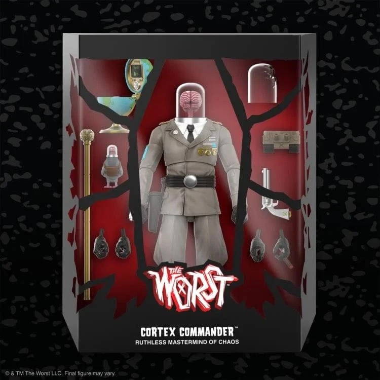 The 7” scale The Worst ULTIMATES! Cortex Commander figure includes multiple interchangeable heads domes and hands, his staff, tank, globe computer, revolver, removable holster, and his sidekick Cortex Pigeon. Skilled in the art of war, psychological manipulation, and psychokinetic marksmanship, Cortex Commander can achieve anything he sets his mind to. Pray you don’t have to match wits with this terrifying general and his single-minded armies of chaos.